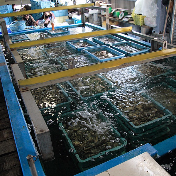 水揚げされたばかりの小長井牡蠣は、諫早湾漁協が誇る「紫外線滅菌プール」で一晩かけて清涼な海水に漬けられ、鮮度ピチピチの状態でお送りいたします。