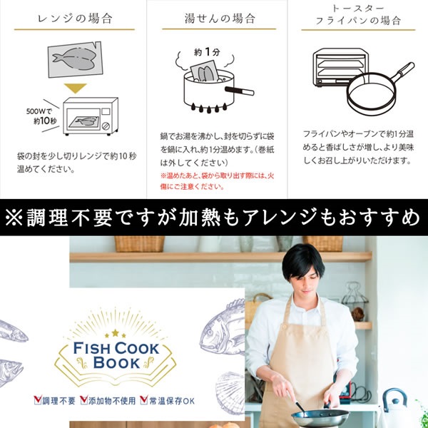 外装から取り出して袋のままレトルトパック商品のように湯煎で温める、あるいは袋の封を少し切りレンジで10秒温める、あるいは中身をオーブンやフライパンなどで香ばしく焼いていただけますと、より一層美味しくお召し上がりいただけます。挟んだり、ほぐしたりして、栄養価の高い時短料理の食材としてアレンジされる方もいらっしゃいます。