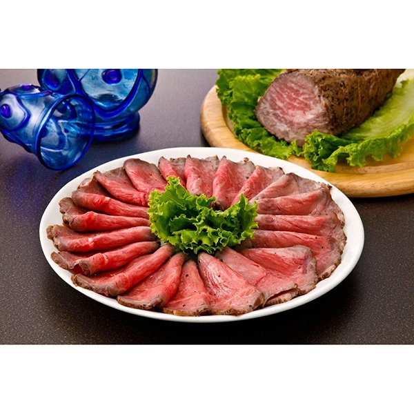 貯蔵庫にて20日間長期熟成させ長崎和牛専用配合の香辛料で味付けし、旨味を封じ込める独特の二段加熱法で丁寧に焼き上げて最上級のローストビーフに仕上げました。