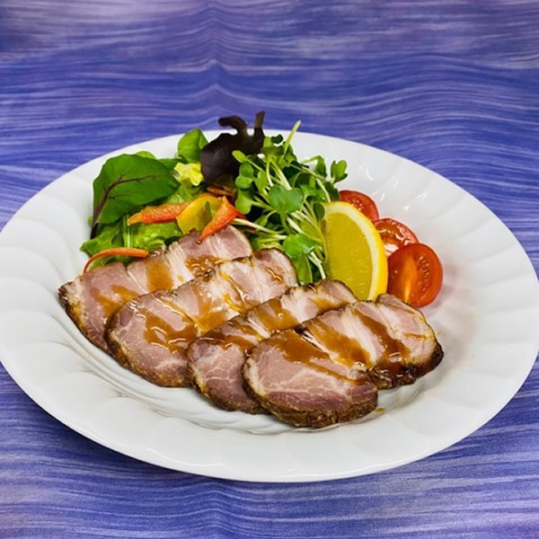 【焼豚】長崎県産SPF五島美豚の肩ロースを特製のスパイスと自家製のタレにじっくり漬け込んだ後、一本一本タレをぬりながら丁寧に焼き上げました。