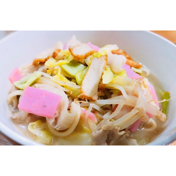 ちゃんぽんスープ(20g)食塩、畜肉エキス、ぶどう糖、砂糖、粉末醤油、脱脂粉乳、魚介エキス、香辛料、ラード/調味料(アミノ酸等)、(一部に豚肉、大豆、乳、小麦、えび、かにを含む)
