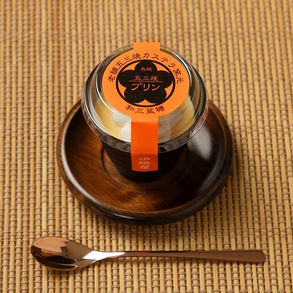五三焼かすてらと同じ長崎のブランド卵、阿波の和三盆糖に九州の牛乳を使用し、それらが織りなす上品な甘みと風味と食感はスプーンで食べる五三焼かすてら。