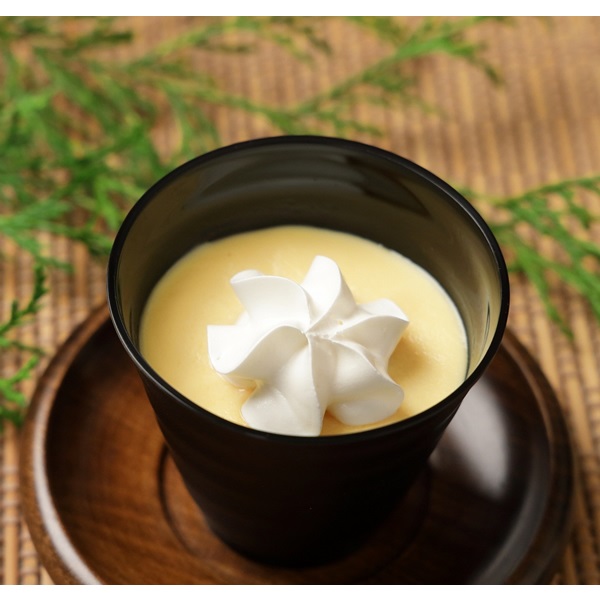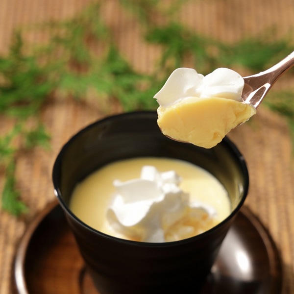 五三焼かすてらと同じ長崎のブランド卵、阿波の和三盆糖に九州の牛乳を使用し、それらが織りなす上品な甘みと風味と食感はスプーンで食べる五三焼かすてら。