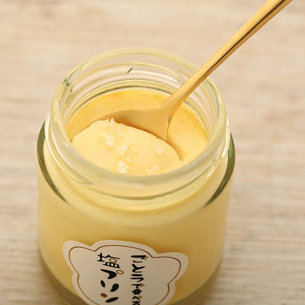 濃厚でなめらかなプリンです。まずはそのままで一口、次に海塩ごとうを適量かけてお召し上がりくださいませ。